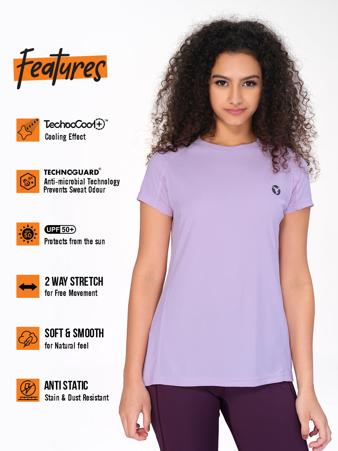 Experience peak comfort and style in our Women's Active T-Shirt. Infused with TechnoCool for a cool feel, Technoguard for freshness, UPF50+ sun protection, 2-Way Stretch for flexibility, Soft & Smooth touch, and Anti Static technology for all-day comfort. Elevate your active wardrobe effortlessly