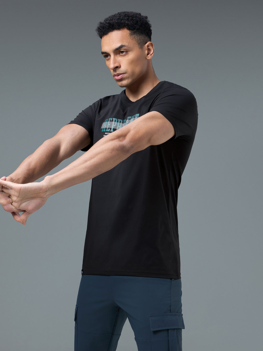 Men Round Neck Typography Printed Active Out Slim Fit T-Shirt with ELASTOPLUS