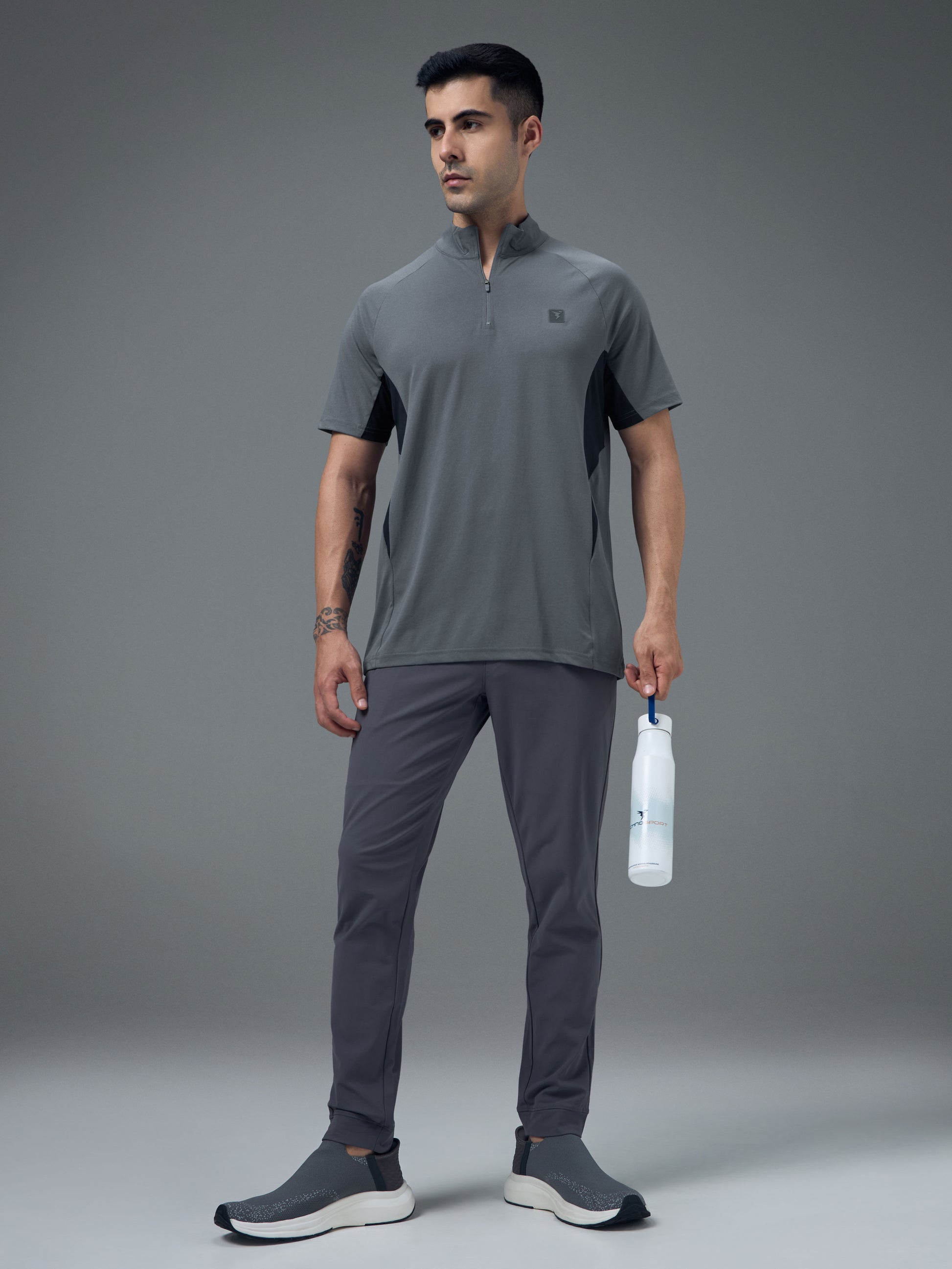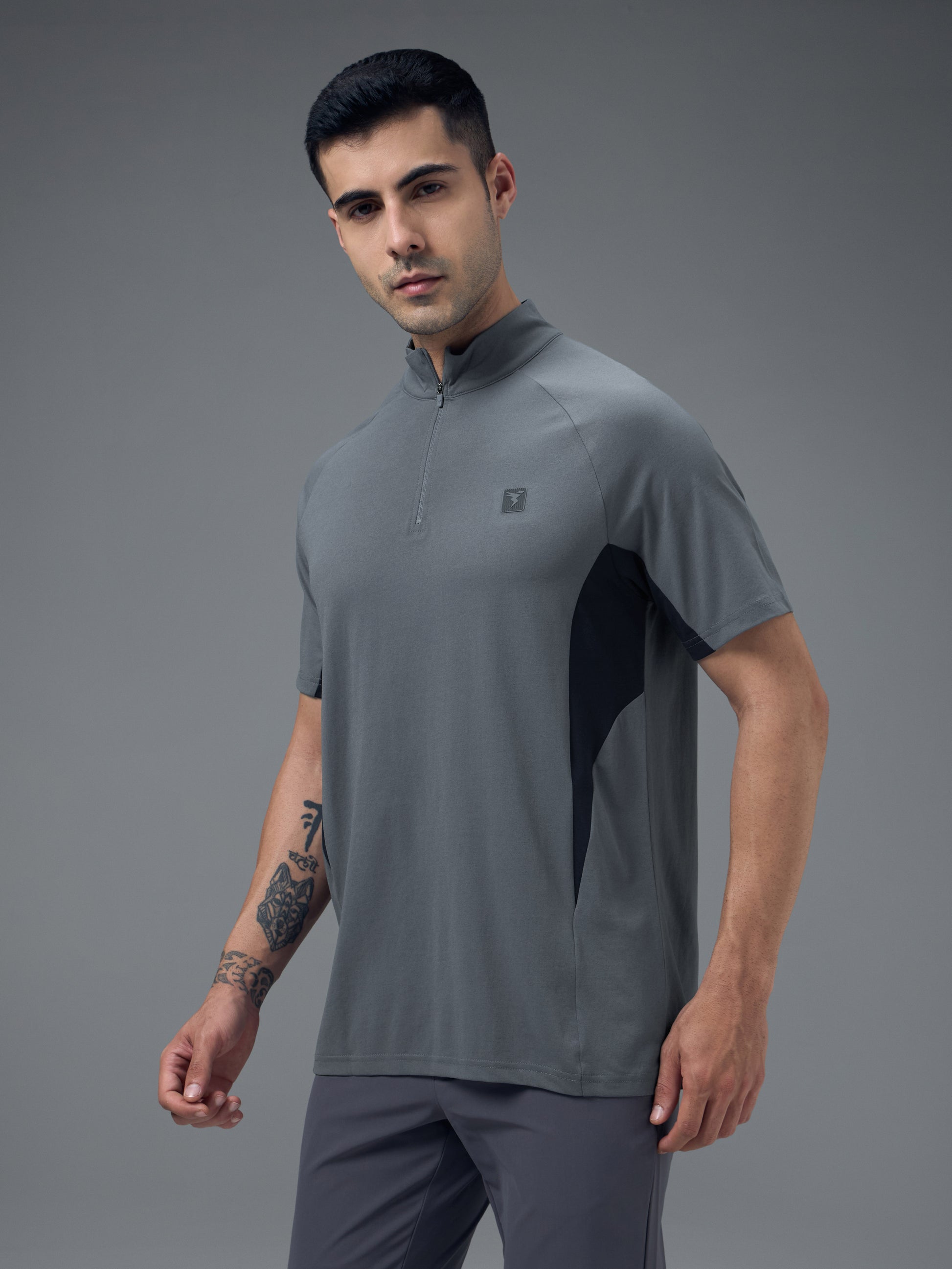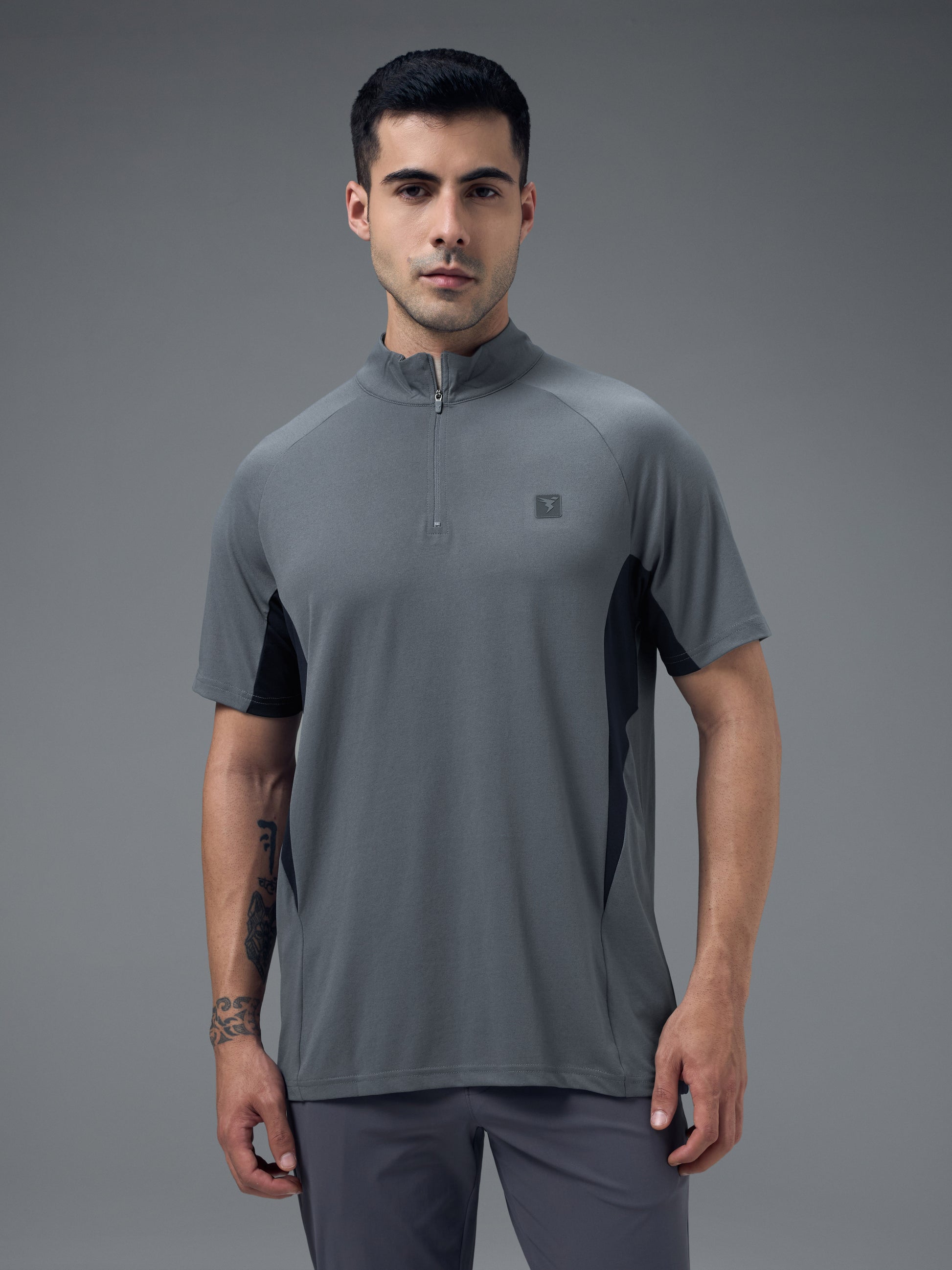 Offer Valid on a Minimum Cart Value of ₹999Men Colorblock Slim Fit Mock Neck Sports T-shirt with COTFLEX