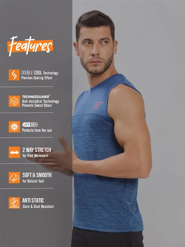 Maximize your cool factor in our Men's Gym Vest with DOUBLE COOL for an extra cooling effect. Featuring UPF50+ sun protection, ODOURFREE freshness, TECHNOGUARD anti-microbial shield, 2-Way Stretch for freedom of movement, Soft & Smooth touch, and Anti Static technology. Elevate your workout experience with unparalleled comfort.