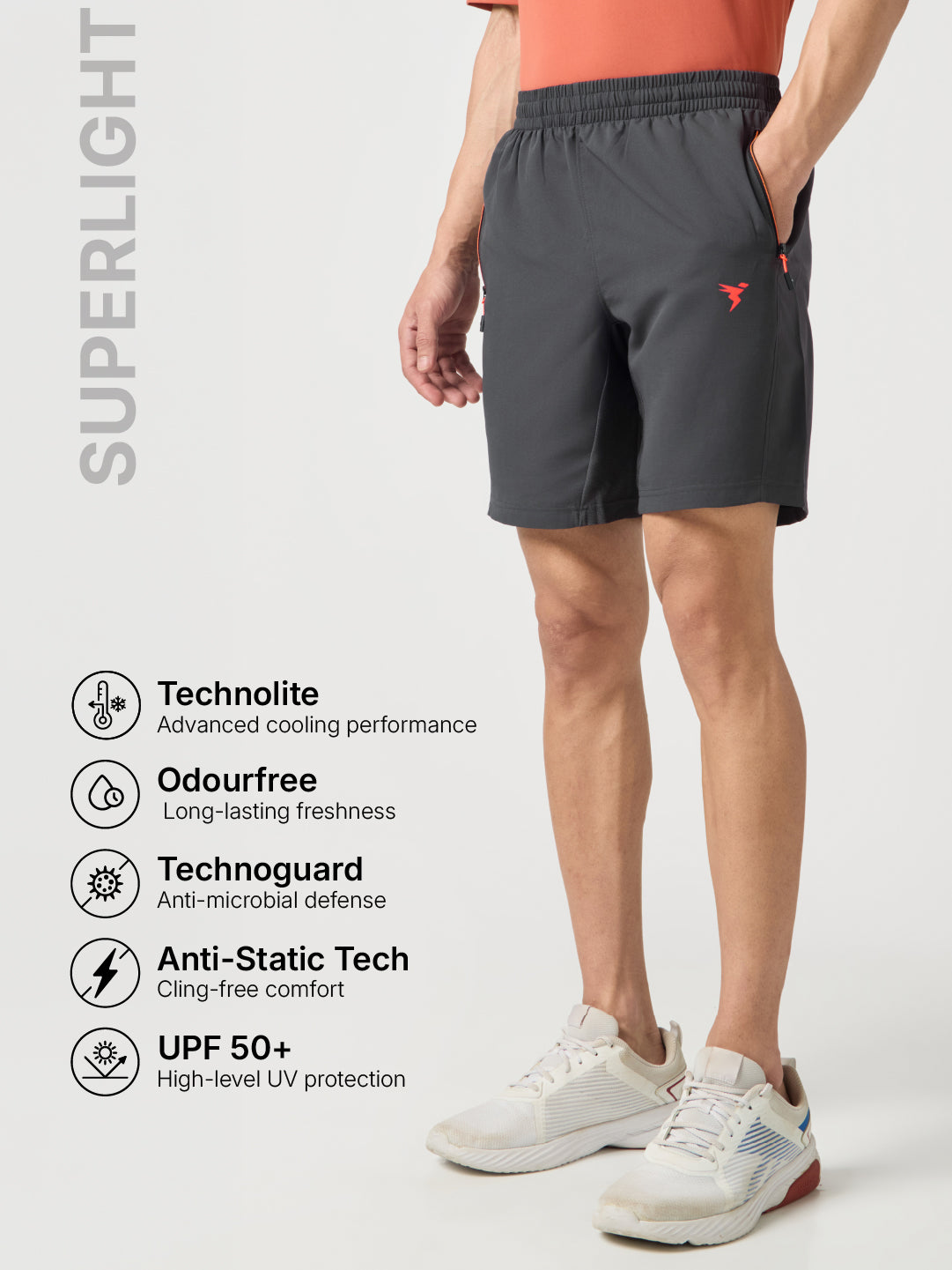 Experience the feather-light comfort of our Men's Active Shorts with TECHNO LITE, providing a light yet durable woven fabric. Enjoy UPF50+ sun protection, ODOURFREE technology, TECHNOGUARD anti-microbial innovation, Soft & Smooth feel, and Anti-Static features. Elevate your active style effortlessly!
