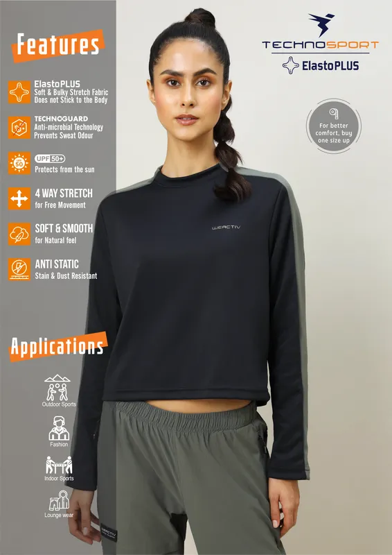 Conquer your workout in style with our Women's Active Sweatshirt, featuring ELASTO PLUS for extra stretch in a durable fabric. Enjoy UPF50+ sun protection, ODOURFREE freshness, TECHNOGUARD anti-microbial shield, 4-Way Stretch for unrestricted movement, Soft & Smooth touch, and Anti Static technology. Experience the pinnacle of comfort and performance.