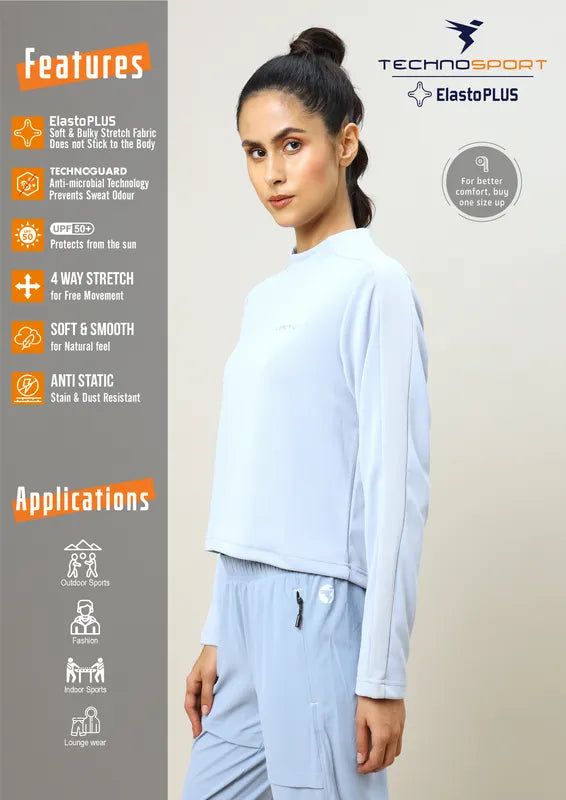 Conquer your workout in style with our Women's Active Sweatshirt, featuring ELASTO PLUS for extra stretch in a durable fabric. Enjoy UPF50+ sun protection, ODOURFREE freshness, TECHNOGUARD anti-microbial shield, 4-Way Stretch for unrestricted movement, Soft & Smooth touch, and Anti Static technology. Experience the pinnacle of comfort and performance.