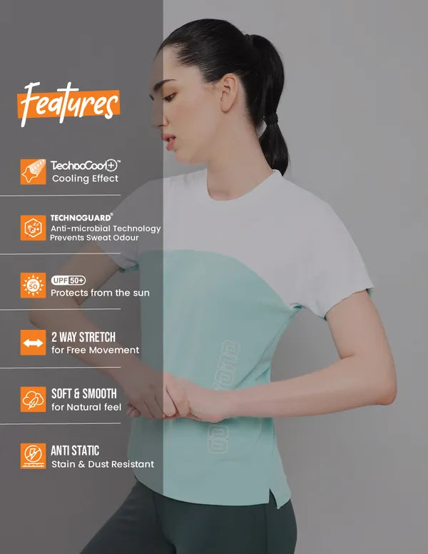 Offer Valid on a Minimum Cart Value of ₹999Women Colorblock Slim Fit Crew Neck T-shirt with TECHNO COOL+
