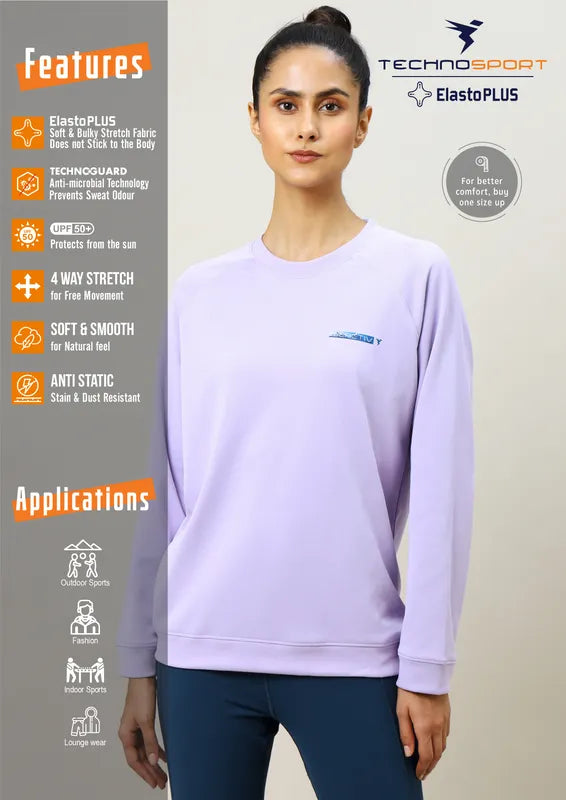 Conquer your workout in style with our Women's Active Sweatshirt, featuring ELASTO PLUS for extra stretch in a durable fabric. Enjoy UPF50+ sun protection, ODOURFREE freshness, TECHNOGUARD anti-microbial shield, 4-Way Stretch for unrestricted movement, Soft & Smooth touch, and Anti Static technology. Experience the pinnacle of comfort and performance.