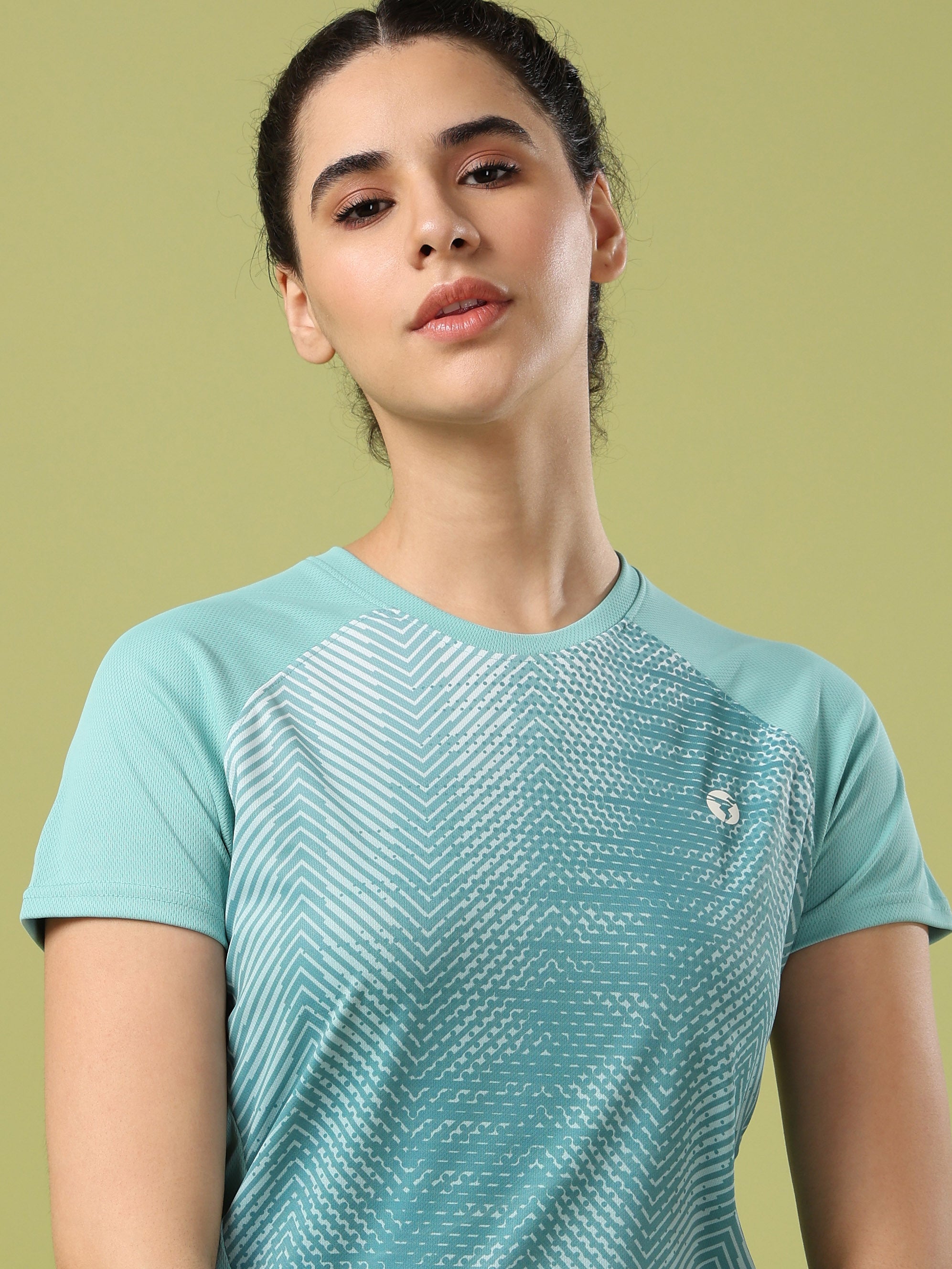 Offer Valid on a Minimum Cart Value of ₹999Women Abstract Print Slim Fit Crew Neck T-shirt with TECHNO COOL+