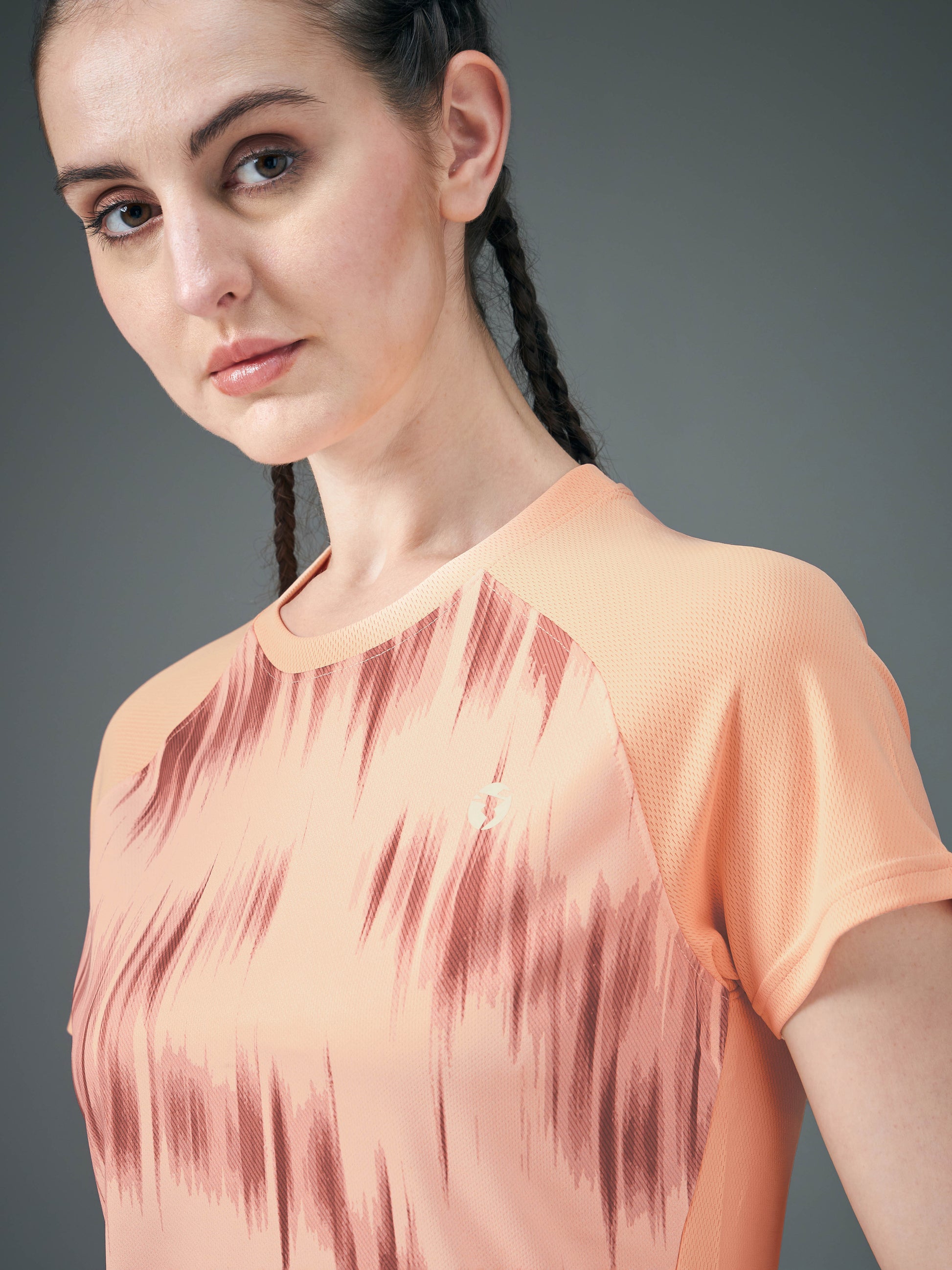 Offer Valid on a Minimum Cart Value of ₹999Women Abstract Print Slim Fit Crew Neck T-shirt with TECHNO COOL+