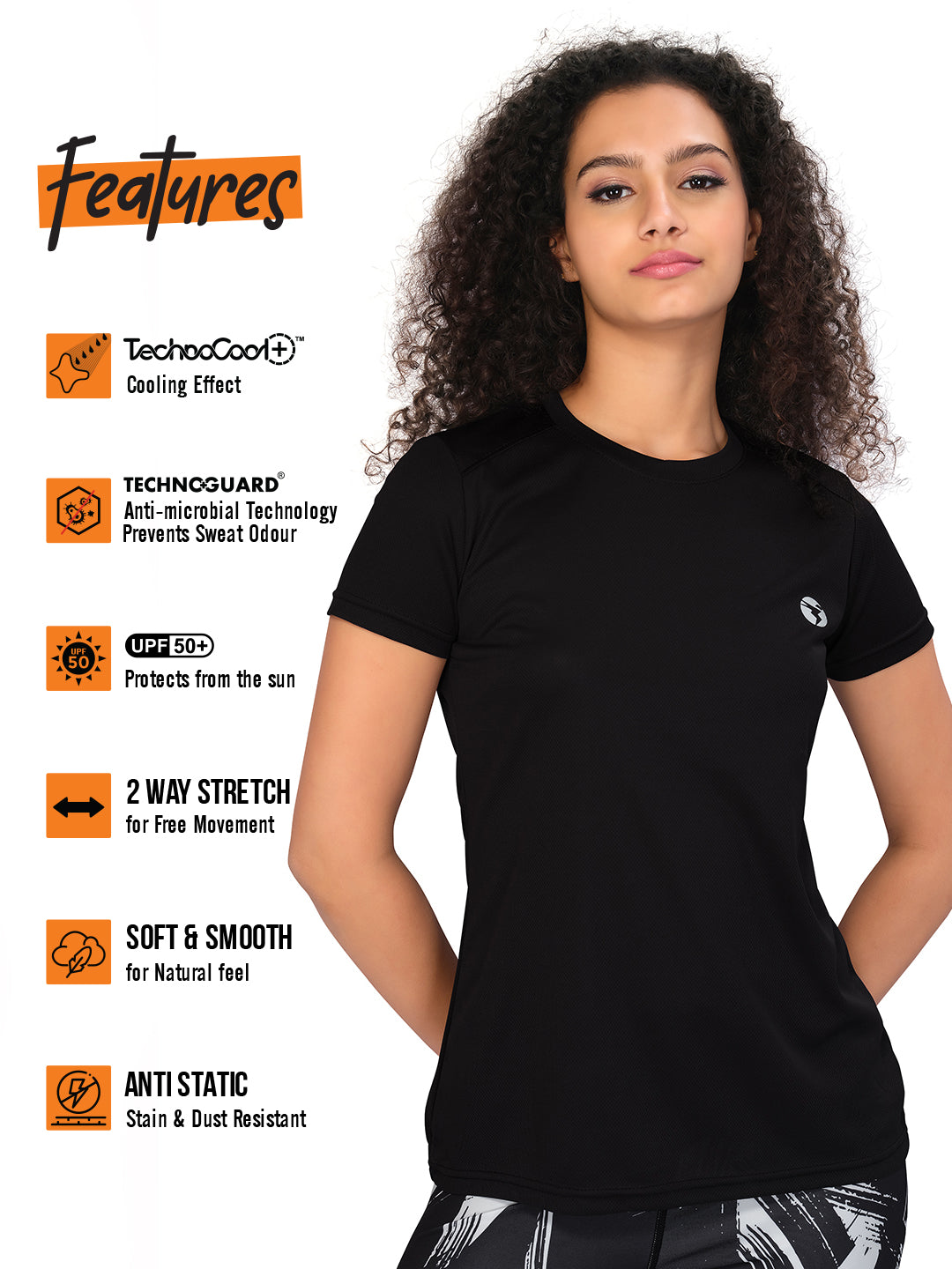 Experience peak comfort and style in our Women's Active T-Shirt. Infused with TechnoCool for a cool feel, Technoguard for freshness, UPF50+ sun protection, 2-Way Stretch for flexibility, Soft & Smooth touch, and Anti Static technology for all-day comfort. Elevate your active wardrobe effortlessly