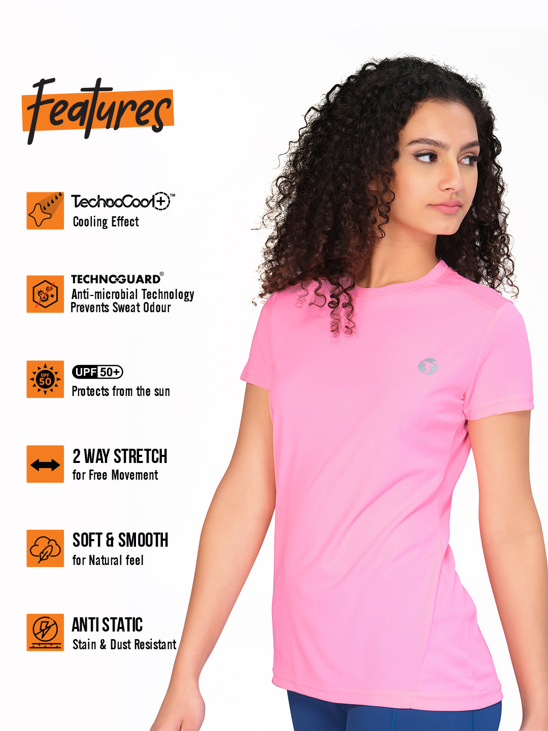 Experience peak comfort and style in our Women's Active T-Shirt. Infused with TechnoCool for a cool feel, Technoguard for freshness, UPF50+ sun protection, 2-Way Stretch for flexibility, Soft & Smooth touch, and Anti Static technology for all-day comfort. Elevate your active wardrobe effortlessly