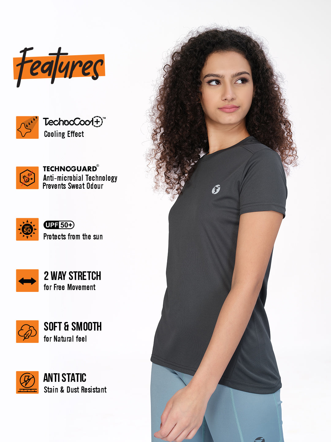 Experience peak comfort and style in our Women's Active T-Shirt. Infused with TechnoCool for a cool feel, Technoguard for freshness, UPF50+ sun protection, 2-Way Stretch for flexibility, Soft & Smooth touch, and Anti Static technology for all-day comfort. Elevate your active wardrobe effortlessly