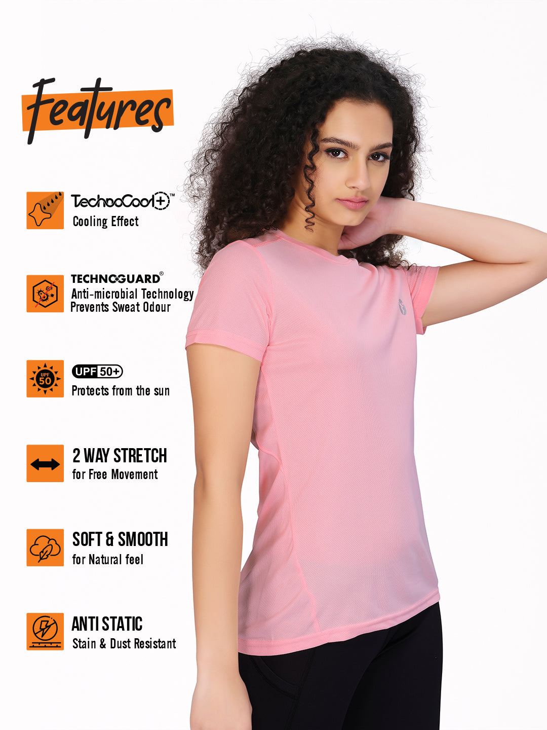 Experience peak comfort and style in our Women's Active T-Shirt. Infused with TechnoCool for a cool feel, Technoguard for freshness, UPF50+ sun protection, 2-Way Stretch for flexibility, Soft & Smooth touch, and Anti Static technology for all-day comfort. Elevate your active wardrobe effortlessly