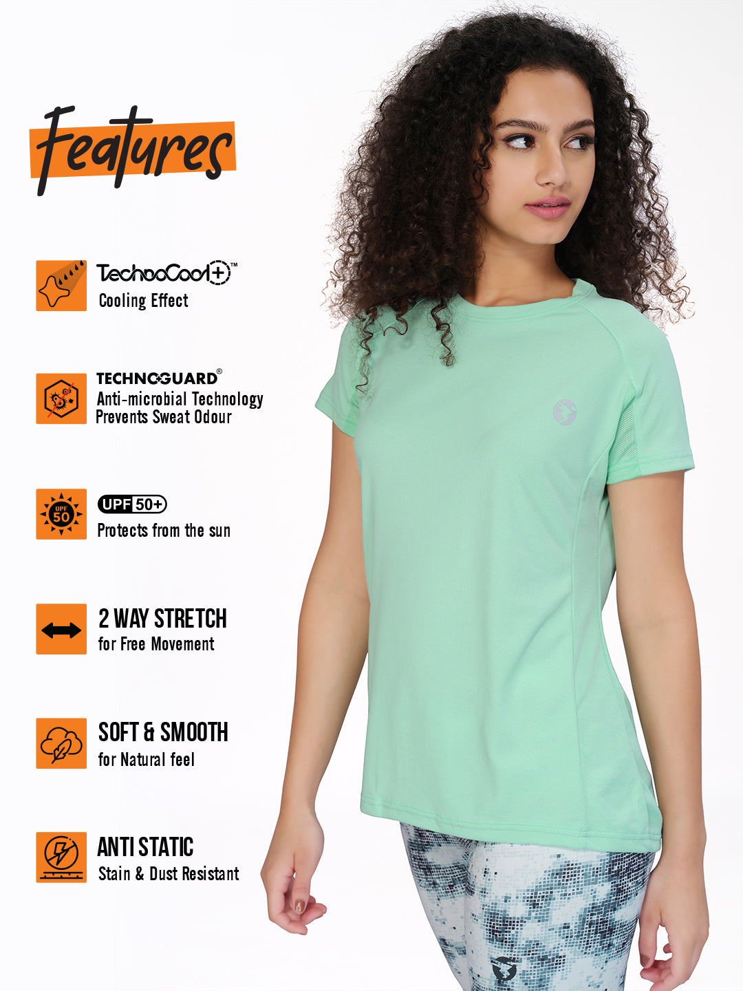 Experience peak comfort and style in our Women's Active T-Shirt. Infused with TechnoCool for a cool feel, Technoguard for freshness, UPF50+ sun protection, 2-Way Stretch for flexibility, Soft & Smooth touch, and Anti Static technology for all-day comfort. Elevate your active wardrobe effortlessly