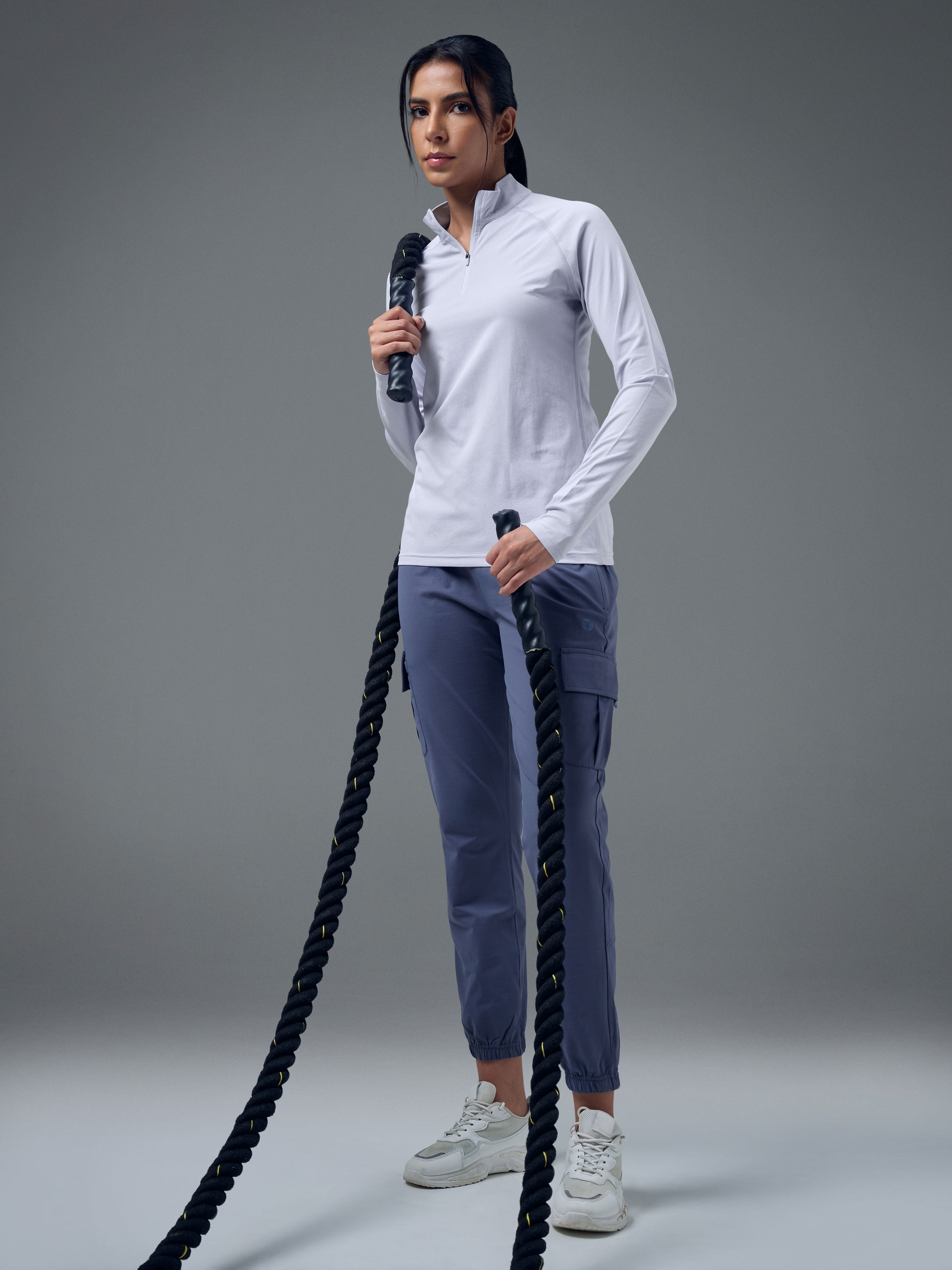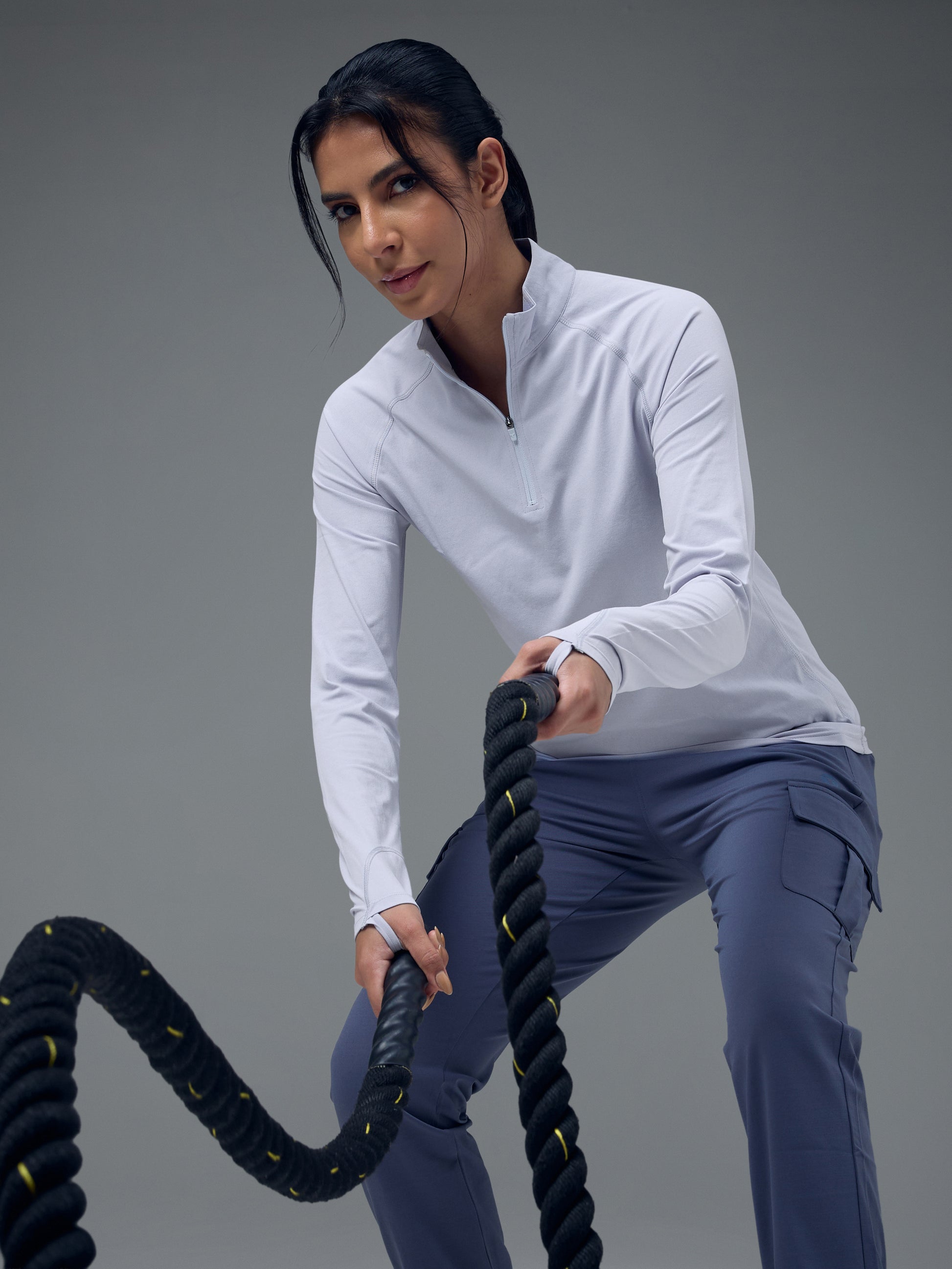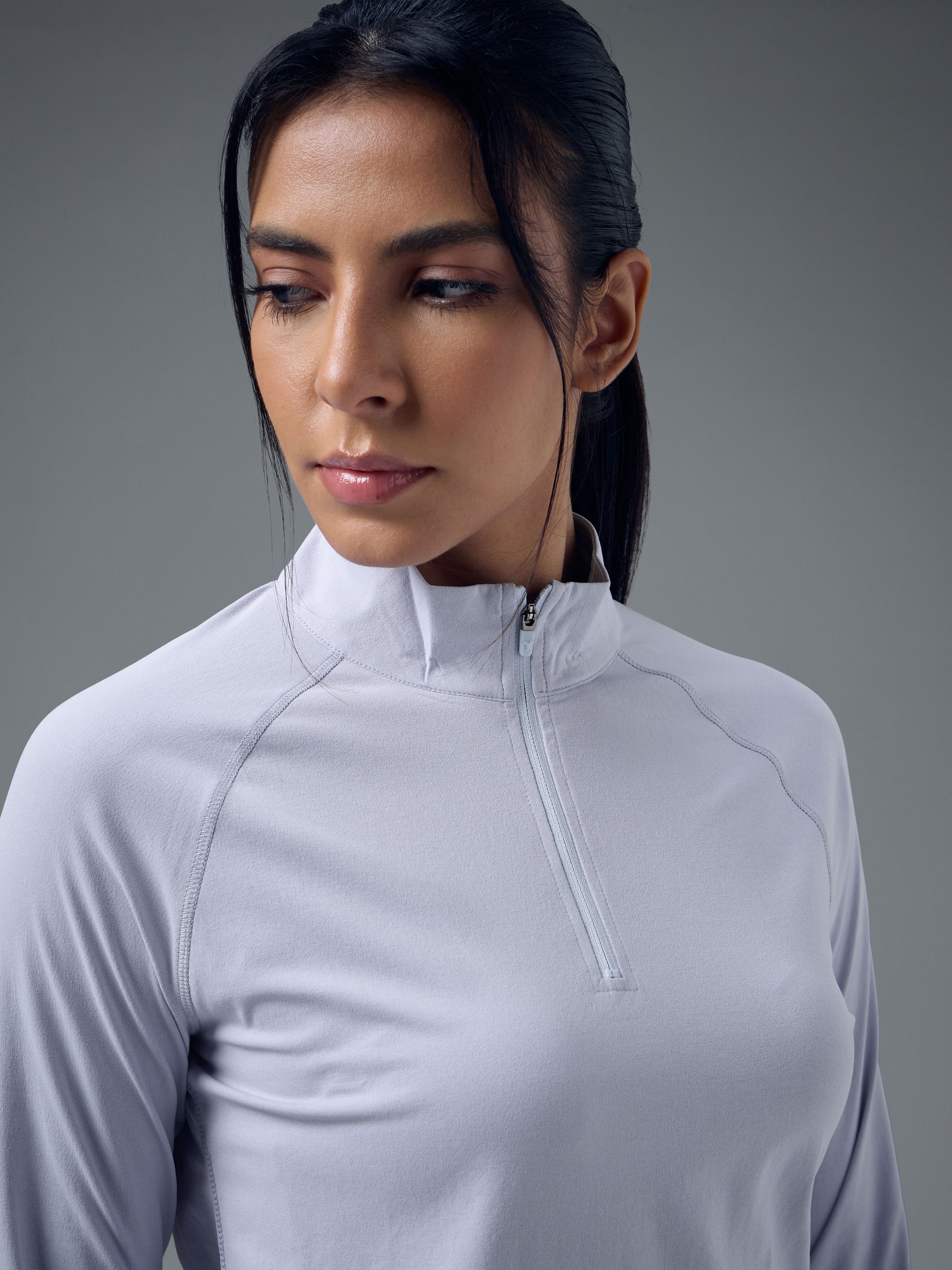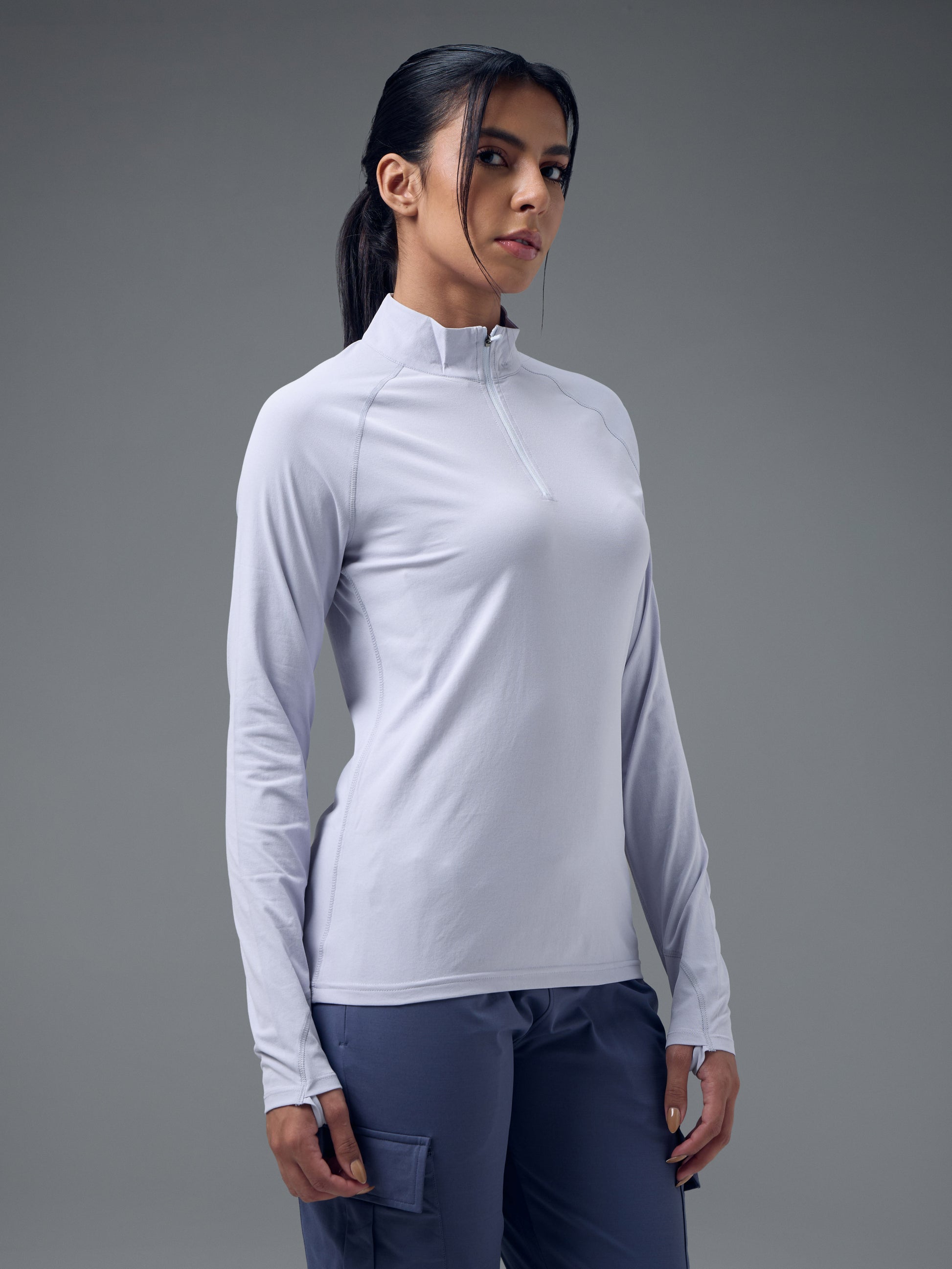 Offer Valid on a Minimum Cart Value of ₹999Women Slim Fit Mock Neck Thumbhole Sleeve Solid T-shirt with COTFLEX